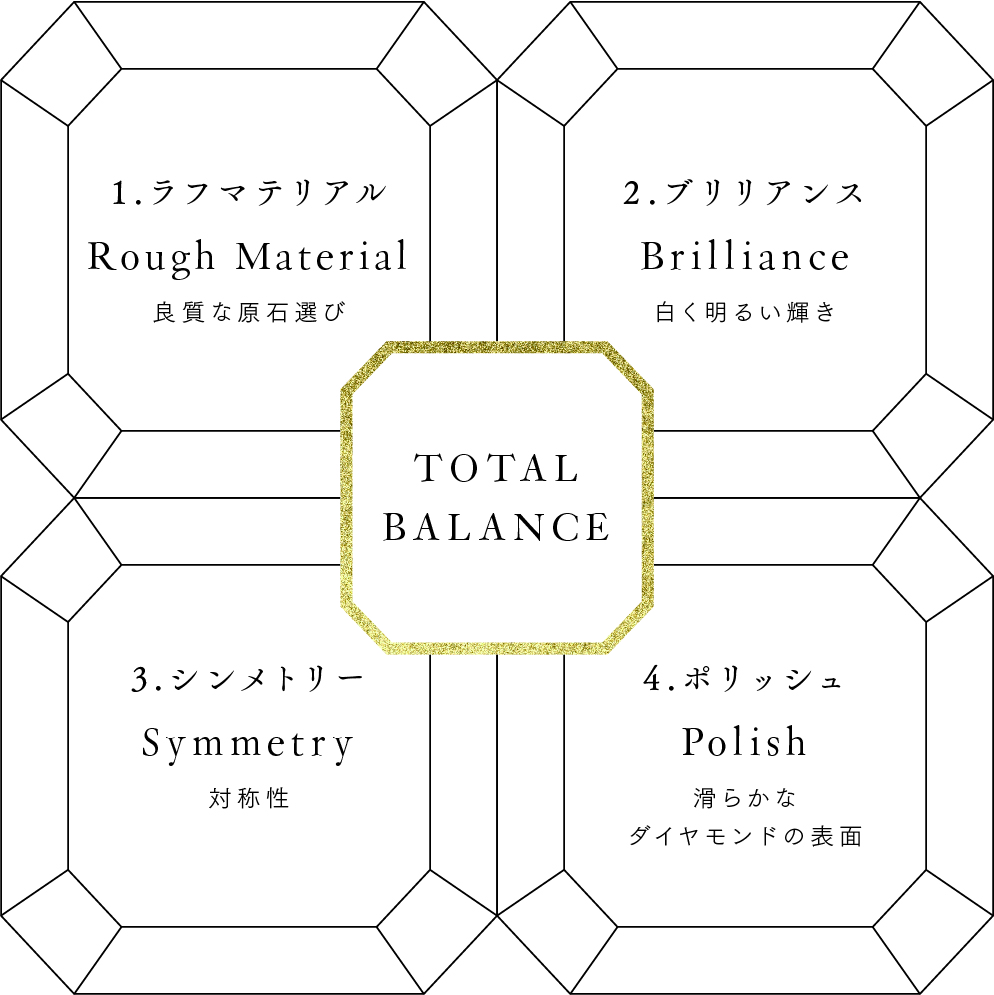 ロイヤル・アッシャー社は美しい輝きのため、原石選びからカット、対称性、磨きまで、4つのトータルバランスを重視しています。