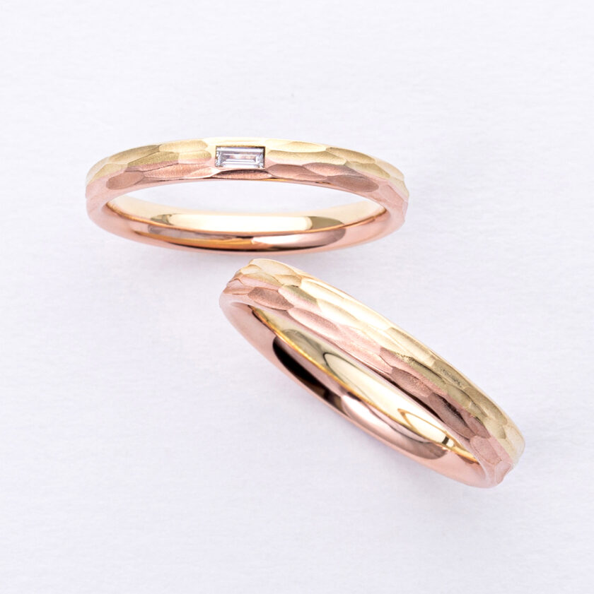 赤みを帯びたレッドゴールドとホワイトゴールドのコンビネーション。 センターベルトに和紙のようなシボ感のあるテクスチャで質感を付けています。 指輪のデザインと同じくらい指にスルっとなじむ着け心地の良さにもこだわって製造して...