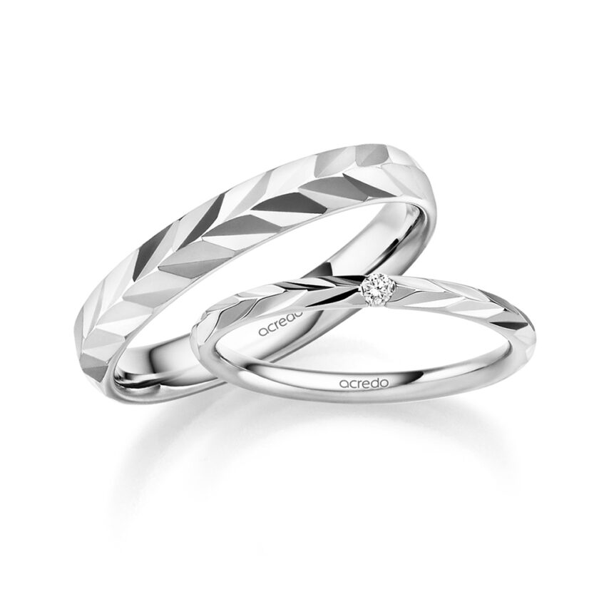 鏡面仕上げと対比するようざらっと感のある和紙テクスチャを組み合わせオリジナリティと上質感を表現しています。 レディースリングには縦に3つダイヤモンドを並べクリアな輝きををアクセントとしています。